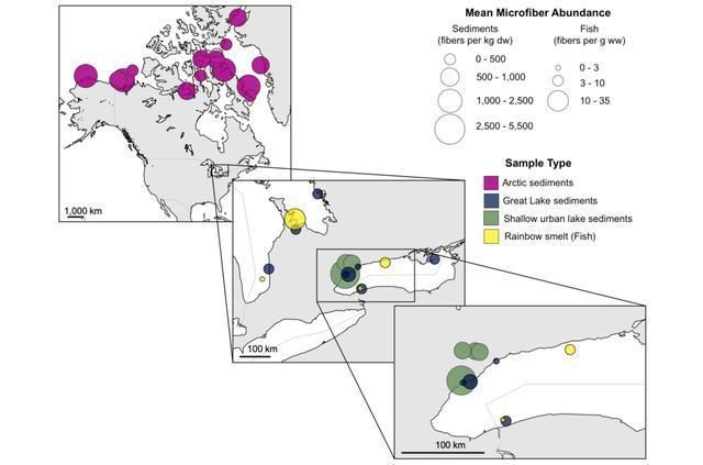 研究人员结合使用了显微镜和拉曼光谱技术。 2014 年至 2019 年期间,它们是从加拿大北极群岛收集的。 、劳伦斯五大湖和安大略省南部的郊区浅湖收集水样。采样范围涉及湖底沉积物和湖边污水处理厂的水样,然后对靛蓝牛仔微纤维进行鉴定和计数。
