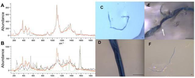 上图各部分为单独显示: (A) 废水处理厂废水中的纤维素; (B) 北极沉积物中的纤维素靛蓝染料复合物; (C) 在北极沉积物中发现的靛蓝牛仔纤维; (D) Great Lakes 鱼中的牛仔纤维; (E) 污水处理厂污水中的牛仔纤维; (F) 从洗涤废水中收集的牛仔纤维。